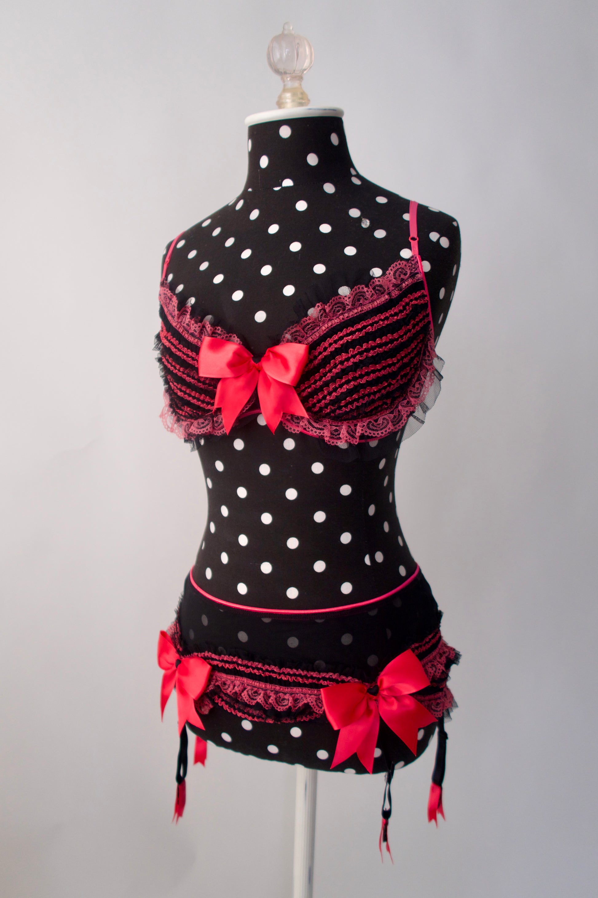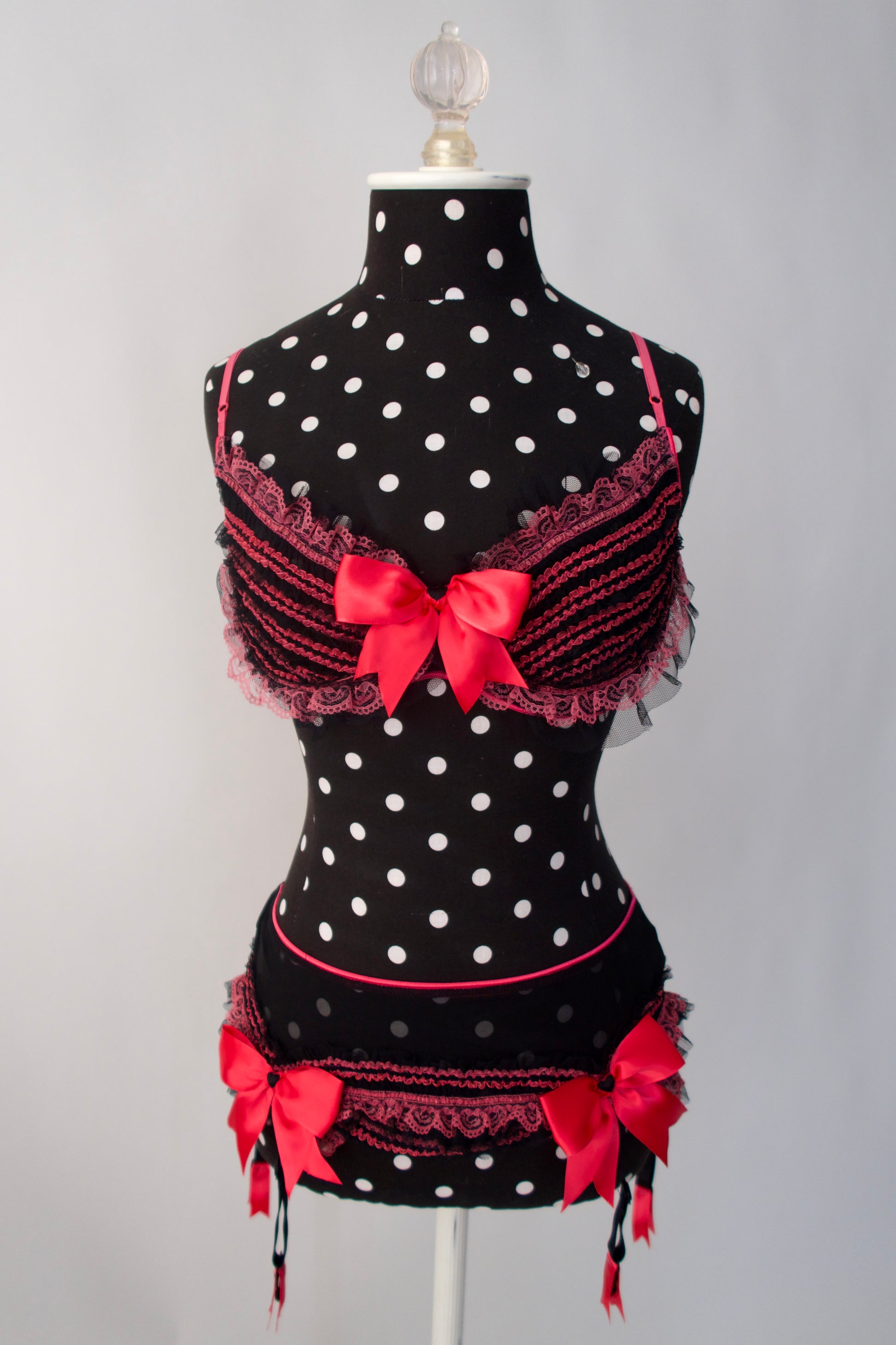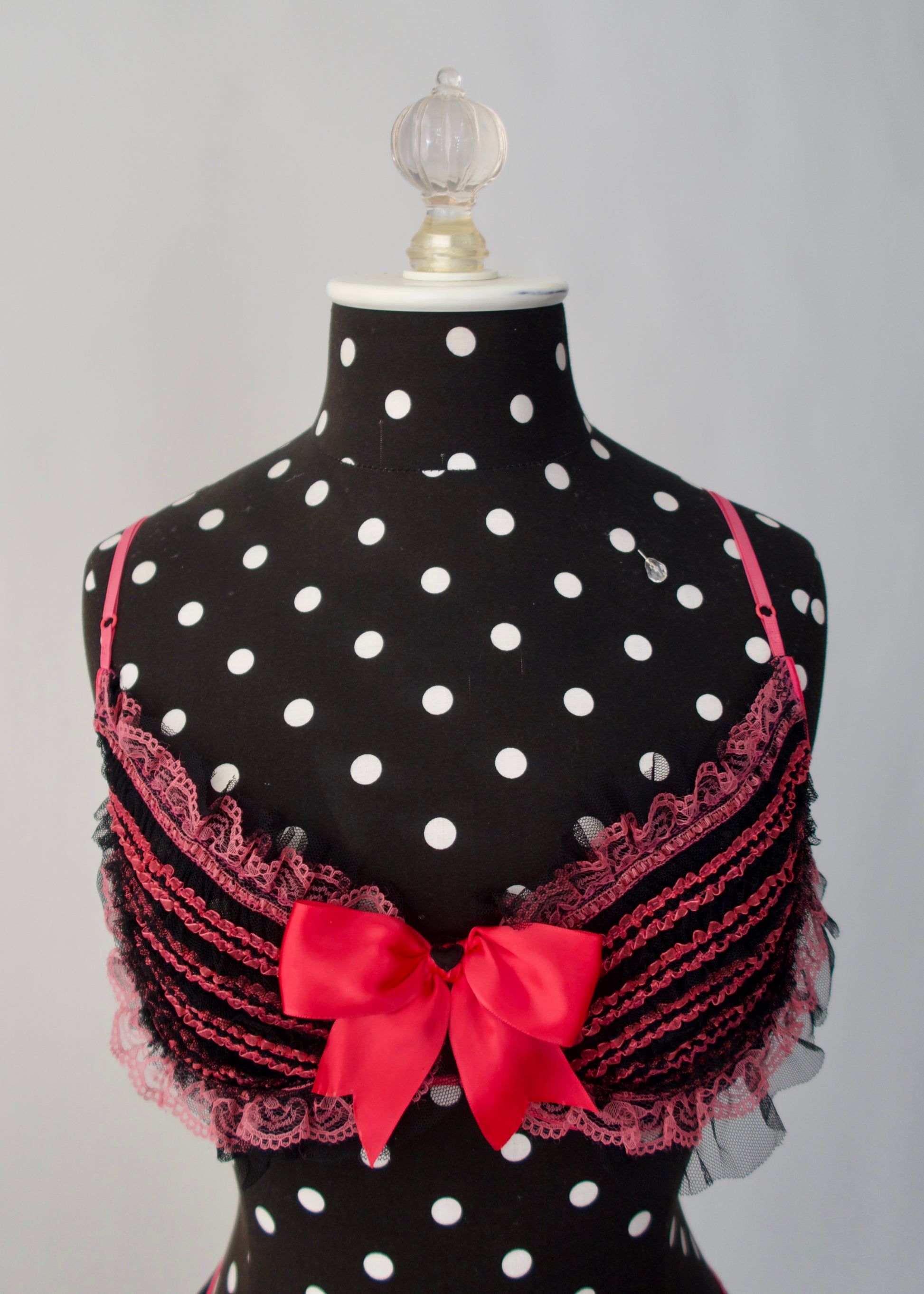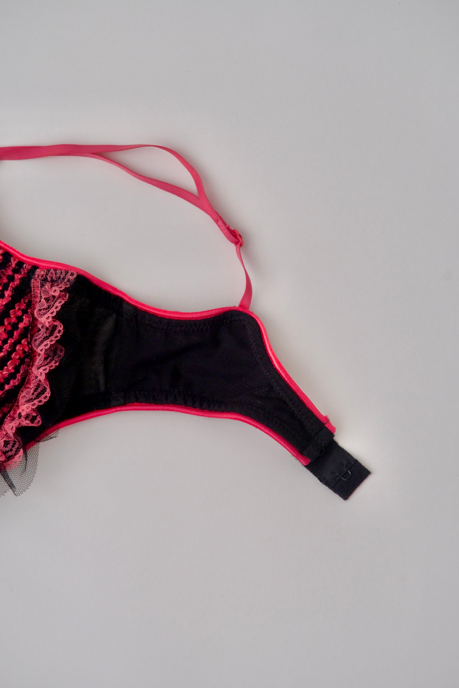 From the iconic Trashy Lingerie store in LA. This is an infamous Carousel bra & panty set in Pink & Black. These pieces are handmade to order by artisans at the only Trashy boutique! This bra specifically was worn by Alexa Demie in Euphora season 1. Trashy has been worn by everyone in all kinds of iconic moments from Pam Anderson in Barb Wire, The House Bunny, Girls Next Door, Easy A and of course THE Madonna Open Your Heart corset. The underwire cups lift and enhance with layers of frills. Wear in or out of the bedroom for a fun flirty time.